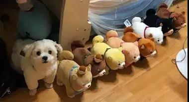 我買了好幾只可愛的狗狗公仔排成一排
